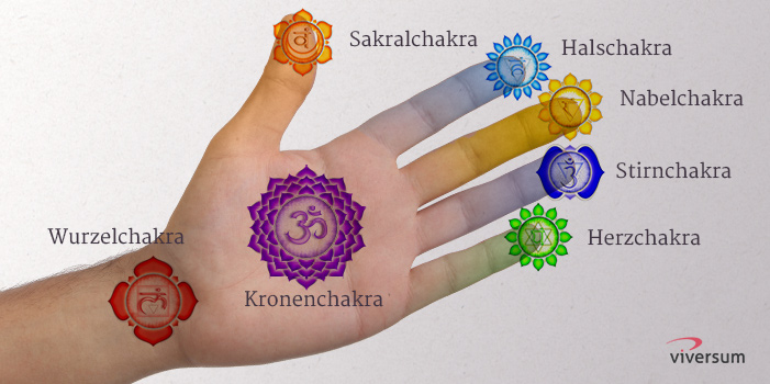 Das Wort „Chakra“ stammt aus dem Sanskrit und wird mit „Rad“ übersetzt. Rund wie ein Rad stellt man sich die feinstofflichen Energiezentren auch vor. Die sieben Chakren befinden sich an bestimmten Energiepunkten entlang der feinstofflichen Wirbelsäule Sushumna, finden aber ebenso in den Händen ihre Entsprechung: