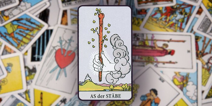 Die Karte As der Stäbe gehört zur kleinen Arkana und eröffnet ungeahnte Chancen, wenn wir die nötige Courage aufbringen. Das Motiv zeigt eine Landschaft, über der eine Wolke schwebt, aus der die Hand des Schöpfers reicht. Sie umfasst einen Stab mit grünen Blättern. Beim Tarotkarten Deuten gilt der Schöpferstab als Zeichen für Wachstum, Willenskraft und Selbstentfaltung. Die Blätter verdeutlichen im Tarot beim As der Stäbe die Vereinigung aller Möglichkeiten der zehn Stabkarten. Für erfreuliche Nachrichten stehen die zu Boden wirbelnden Blätter. Sie haben Gelegenheit, mit Risikofreude aufregende Erfahrungen zu sammeln und sich zu entfalten. Im Beruf könnte eine neue Aufgabe warten, in der Liebe eine neue Begegnung.