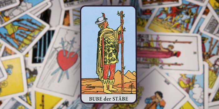 Der Bube der Stäbe im Tarot ist die erste der Hofkarten und findet ihre Zuordnung im Element Feuer. Er fordert auf zur Vorbereitung zum Aufbruch ins Unbekannte. Neues entfacht Begeisterung.